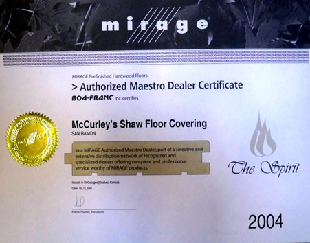 McCurley’s Floor Center, Inc. and Macfloor.com have been distributing and installing Mirage Hardwood Floors and accessories including cleaners and maintenance products for over 45 years. In fact, McCurley’s Floor Center, Inc. has been certified as an Authorized Mirage Maestro Dealer, a selective network of recognized and specialized dealers offering complete and professional service. In addition to residential and commercial projects done directly by McCurley’s Floor Center, we have distributed Mirage Hardwood Flooring products to general contractors, builders, homeowners and many others. Visit our showrooms in the Northern California/Bay Area at San Ramon and Concord, CA to see our extensive line of Mirage Hardwood Flooring and promotional products. |